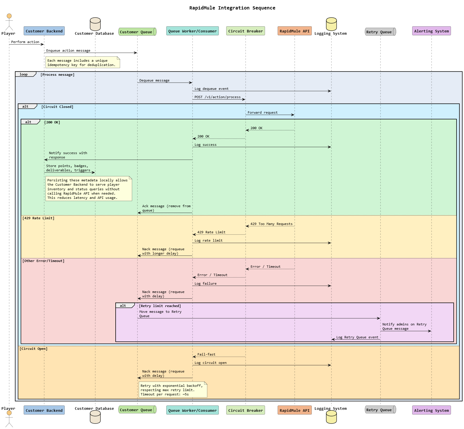 In this guide, you will find detailed information on how to use this API, its methods and their parameters, error handling, and best practices. By the end of this documentation, you'll be well-equipped to integrate RapidMule API into your application and enhance user engagement and satisfaction with gamified journeys. Let's get started!